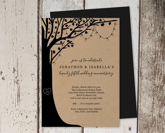 Wedding Anniversary Invitation Template Rustic Tree Wood String Fairy Light Printable Instant Download Digital File 25th 30th 40th 50th by etsy.com