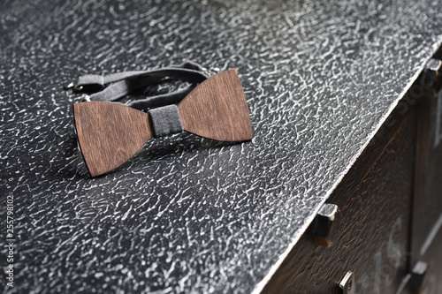 Stylish Men S Brown Wooden Bow Tie With Gray Fabric On An Iron Rough by stock.adobe.com
