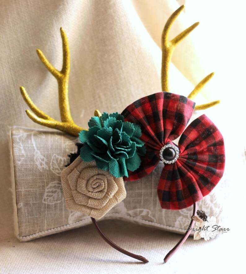 Brown Reindeer Antlers Or Red Black Plaid Green Garland Headband Holiday Style Ebay by ebay.com