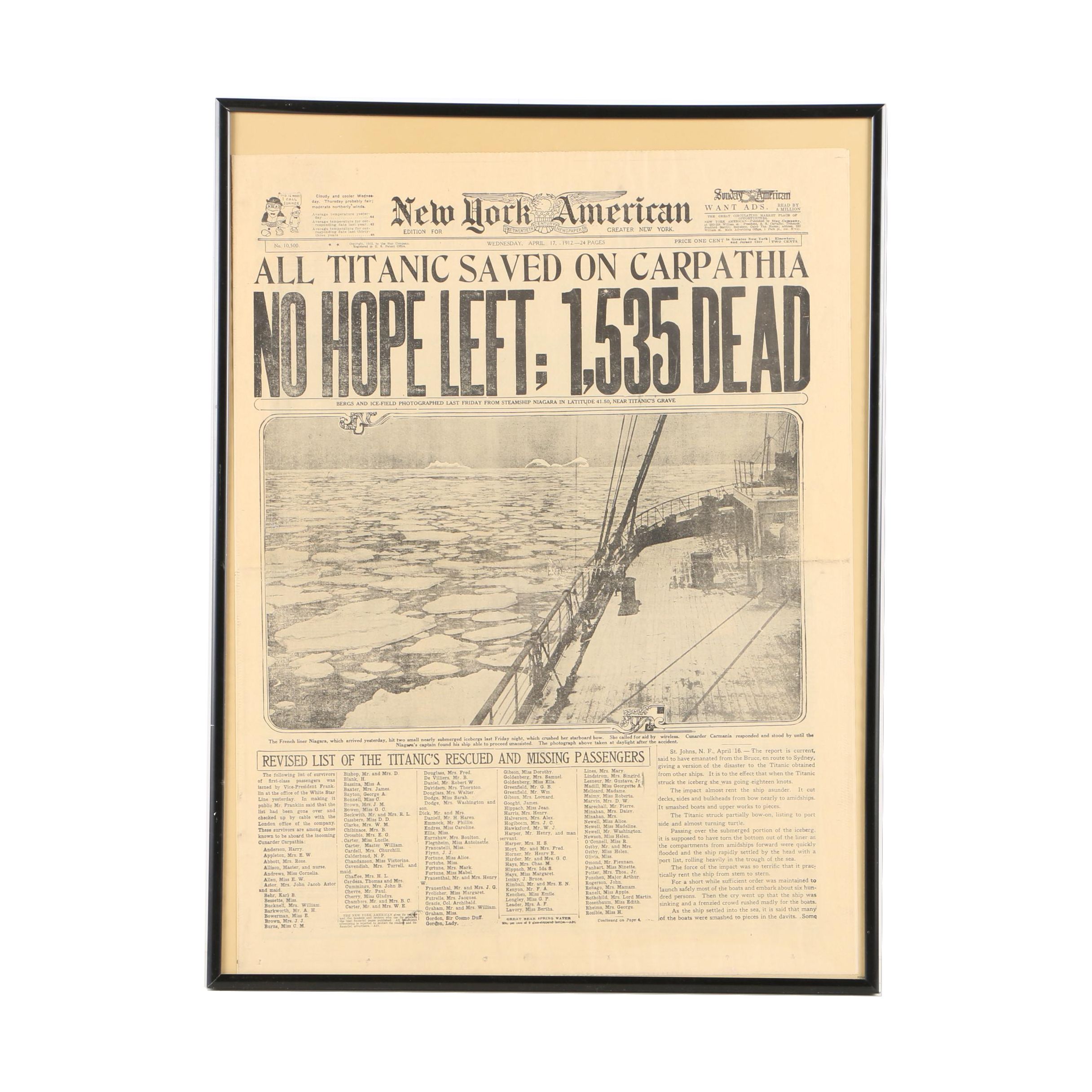 Framed 1912 New York American Newspaper With Titanic Headline by ebth.com