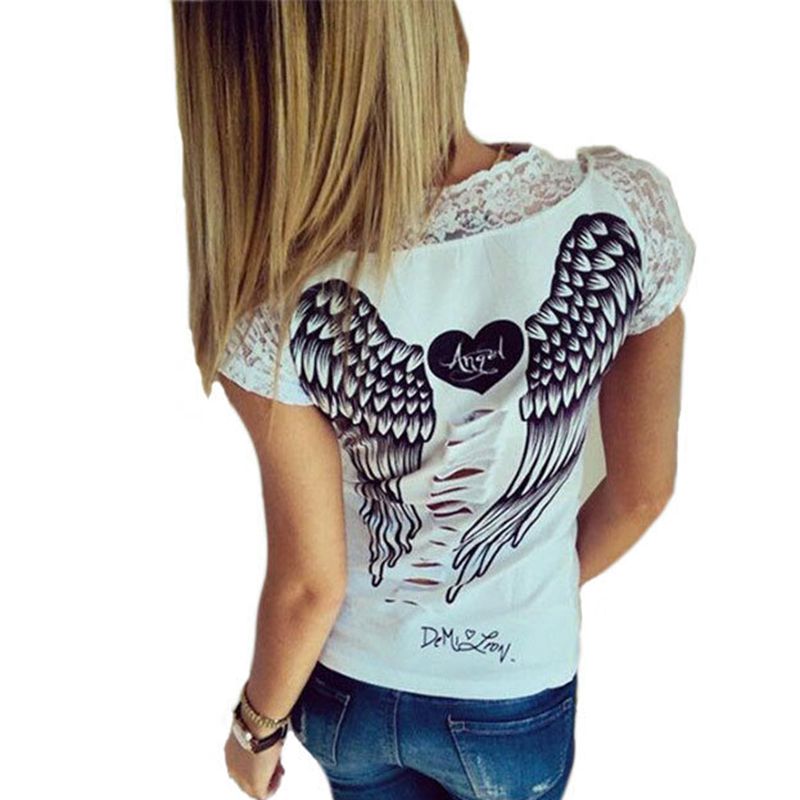 Wholesale Hot Sale Angel Wings Print Lace Patchwork T Shirts For Women Back Laser Cut Hollow Out Short Sleeve Tops 2015 New Ql1764 by dhgate.com