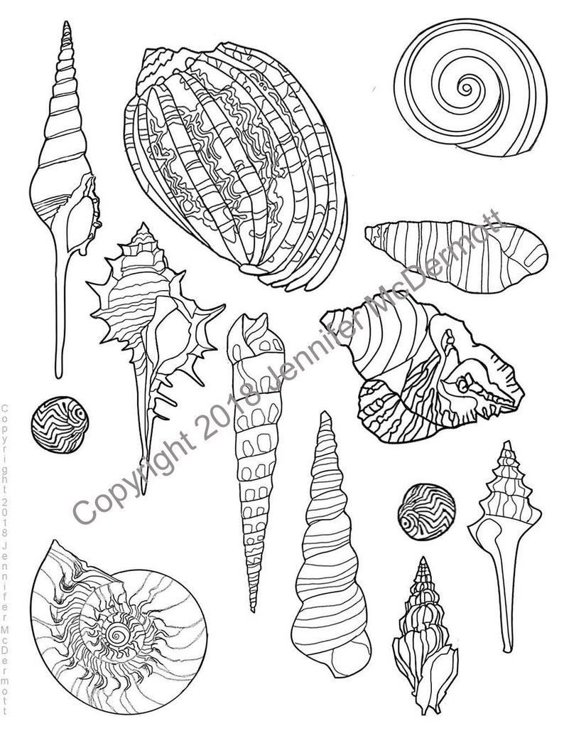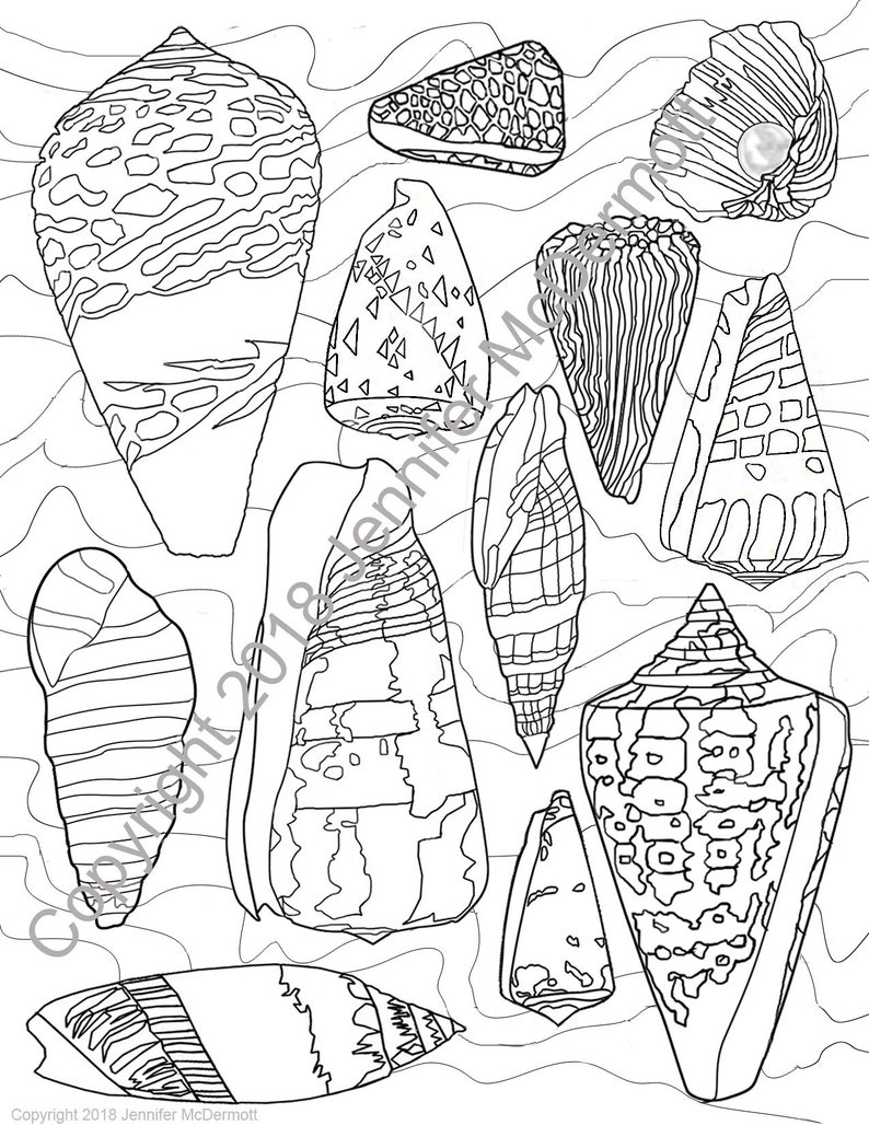 Seashell Coloring Page A Harp Shell Dominates The Arrangement Of Sharp Edged And Circular Shells In This Adult Colouring Page by etsy.com