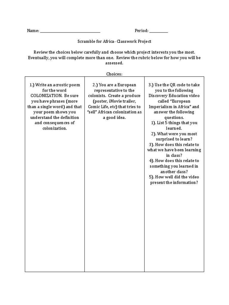 Choice Board Scramble For Africa Colonialism Communication by scribd.com